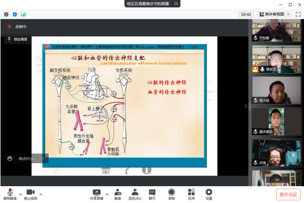 我院领导班子通过腾讯会议,全程在线听取了刘立恒老师的《生物技术制药》和曾庆节老师的《动物生理学》课程。课后,学院领导对两位老师的线上教学内容给予了充分肯定,并对线上教学过程提出了宝贵意见。胡国良院长指出,专业基础课程是学生掌握专业知识技能必修的重要课程,在培养学生实践能力、提高综合素质方面具有重要作用,希望学生明确课程学习的重要性,同时要求教师始终抓住“以学生为主体”,加强师生之间线上互动与交流。陈小志副书记指出,在疫情面前,希望师生统一思想,立场坚定,在配合学校打好抗疫攻坚战的同时做好专业知识的积累,严于律己,认真上好每一课。吴小波副院长提出,要深刻贯彻“停课不停教,停课不停学”,严明课堂纪律,建议学生全程打开摄像头,加强教师对学生的教学督导,保证教学质量“不打折”。