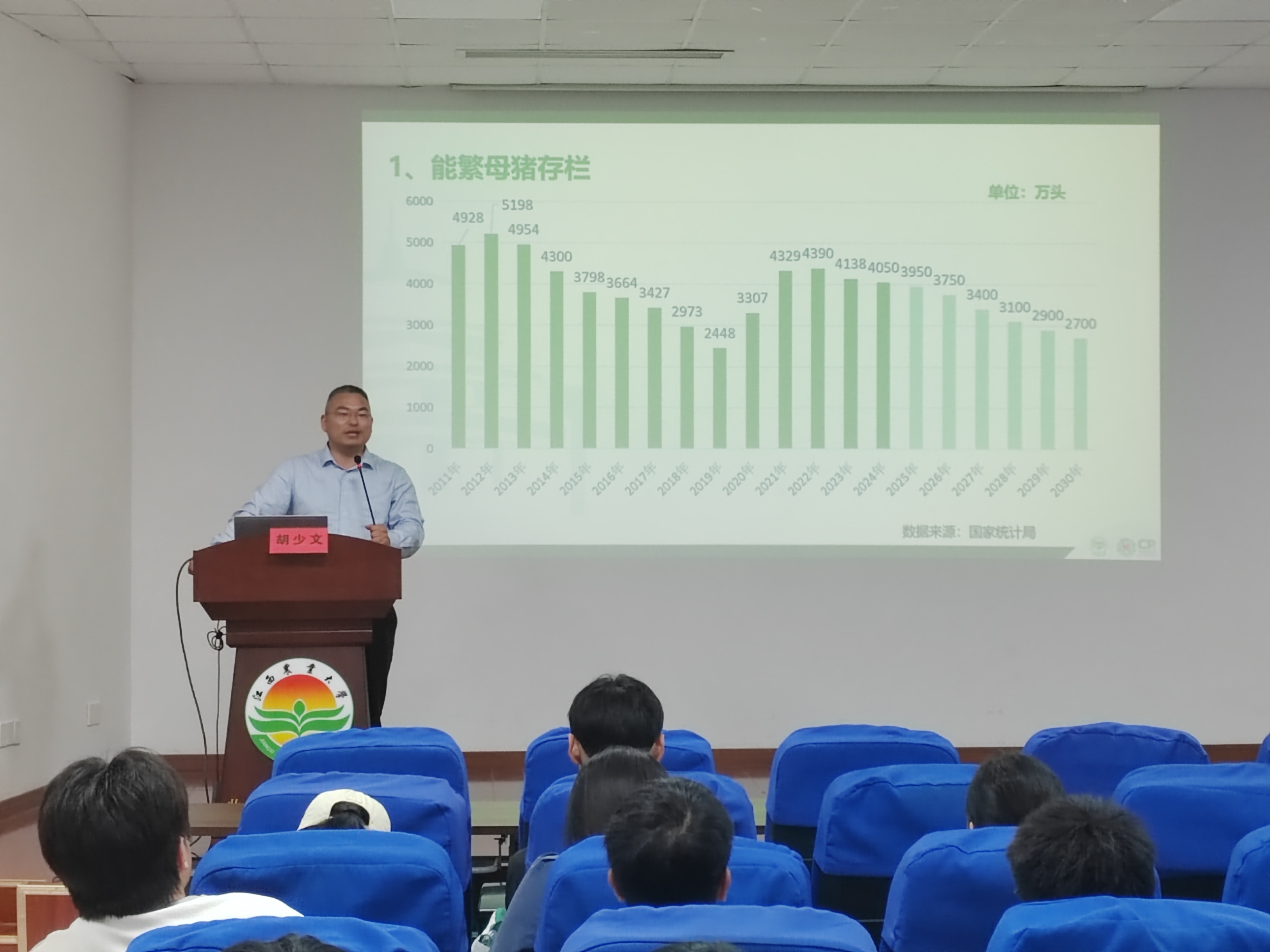 专题讲座环节,胡少文围绕生猪行业展开深入分享。他凭借丰富的行业实践经验,结合详实的数据和案例,对当前生猪市场的供需状况、价格走势、发展趋势等进行了全面分析。他详细介绍了正大集团的发展历程,从正大集团创立的初心使命到不断壮大的发展轨迹,从多元化的业务布局到独具特色的业务亮点,全方位展示了企业的文化底蕴与综合实力。此外,胡少文还结合自身经历,就当代大学生在职业发展过程中普遍面临的问题与同学们展开深入探讨,引发大家的深刻思考,同时希望同学们能把握校企合作机遇,在实践中积累经验,努力成长为农业领域的专业人才。