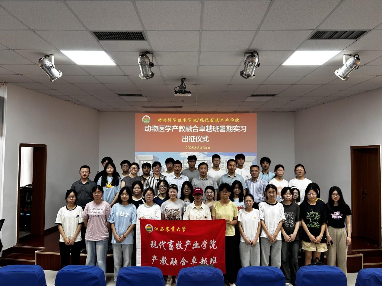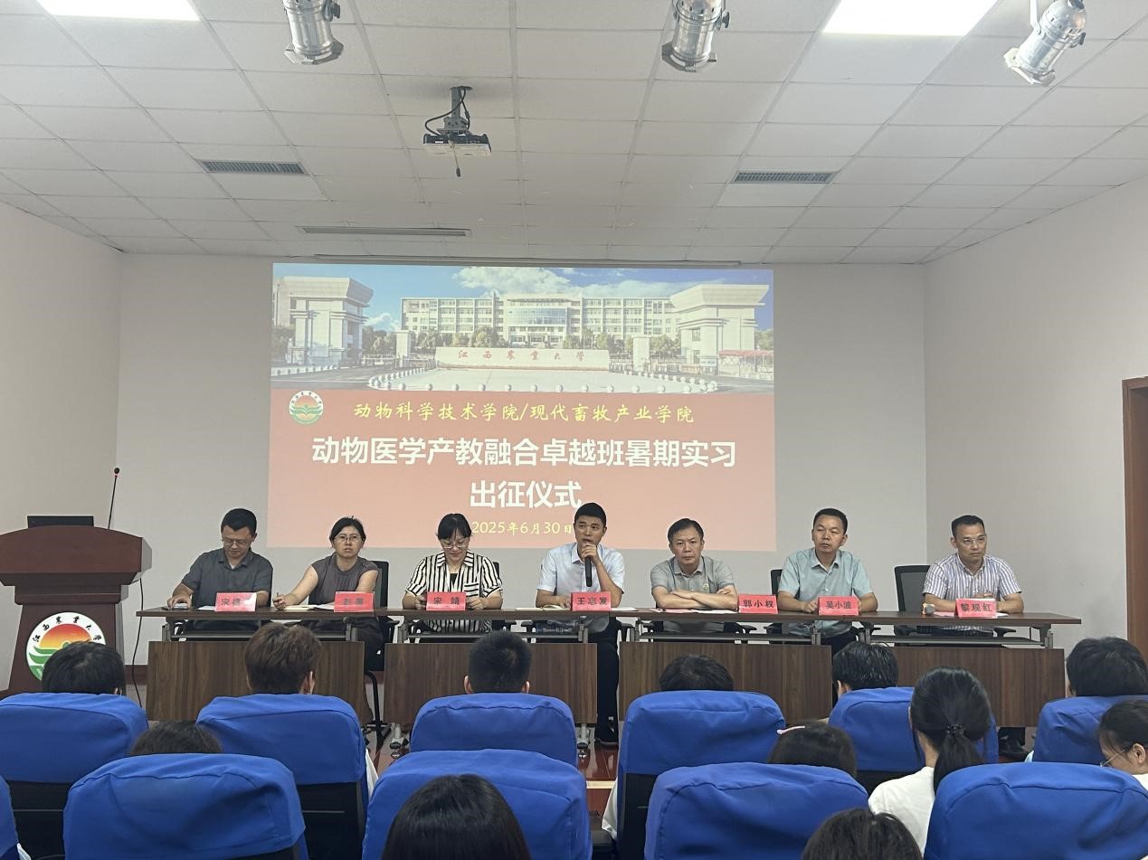为深入贯彻落实习近平总书记关于“深化产教融合、校企合作,培养更多高素质技术技能人才”的重要指示精神,全面落实立德树人根本任务,推动教育链、产业链、人才链深度融合。近日,动物科学技术学院在学院办公楼201报告厅举行首届动物医学产教融合卓越班(动医卓越2301班)学生暑期实习出征仪式,标志着同学们为期一个半月的暑期专业实习实践正式启动。学院党委书记王志发、院长郭小权、党委副书记宋婧、副院长吴小波和彭墨,现代畜牧产业学院副院长黎观红,以及动医卓越2301班班主任宋德平和全体同学参加仪式。仪式由黎观红主持。